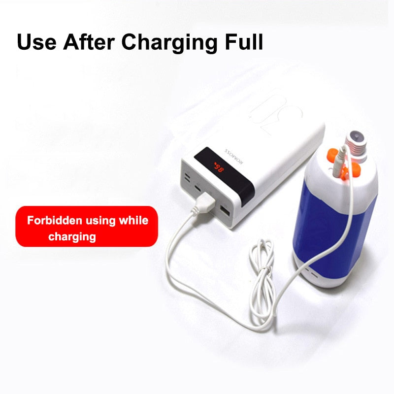 The portable electric shower is charged with DC 5V input. The charging time depends on the size of the output current of your charger. It can use a charger of 5V/2A or 2A more.When you use the 5V / 2A charger, the charging time is about 4 hours. The portable electric shower equipped with low battery indicator light(red) , charging indicator light(blue) and a USB-DC cable, you can connect all the 5V/ 2A or 2A more output of the charging tools, such as mobile phone adapter, power bank, etc., to charge it.