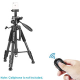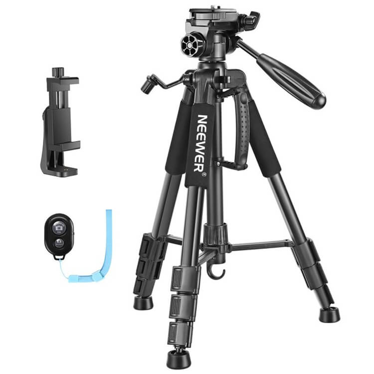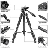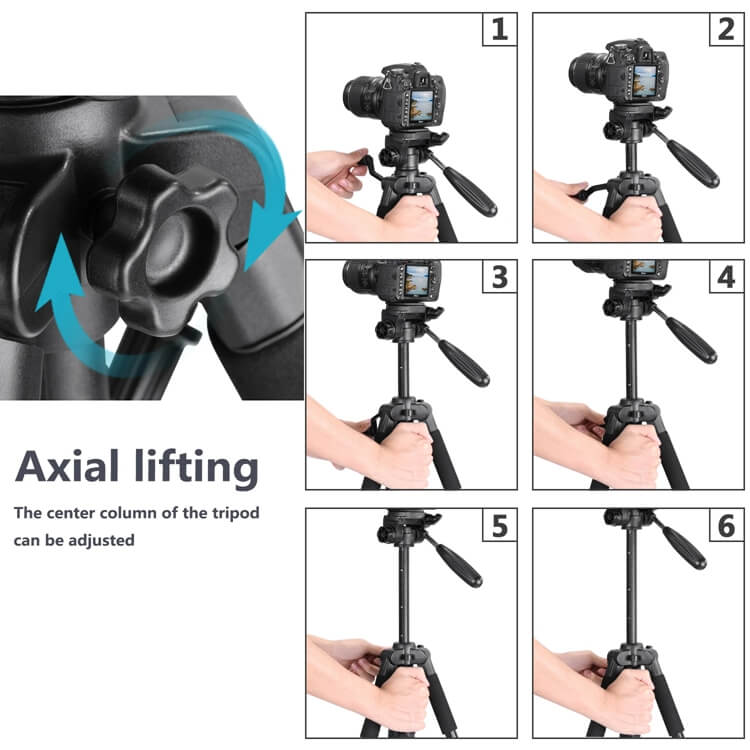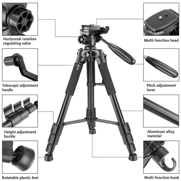 The adjustable tripod also features considerate design. Horizontal rotation valve allows you to take photos at any angle horizontally and vertically; Multi-function hook allows you to hang additional weight for increased stability; Telescopic adjustment handle and pitch adjustment lever provides you with easy operation and convenient shooting adjustment.