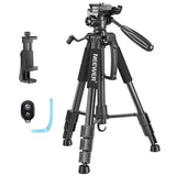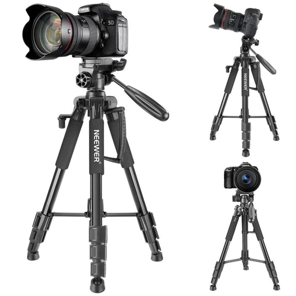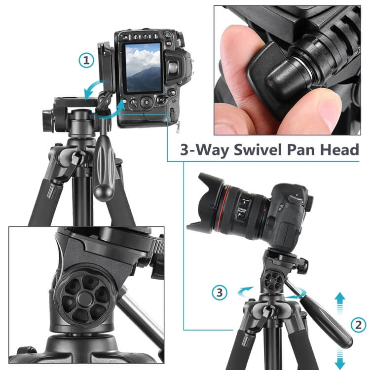 The tripod features 3-way swivel pan head with quick release plate. It boasts 360 degree panning and allows you to take photos at any angle with horizontally and vertically. Accurate panoramas can be easily orchestrated.