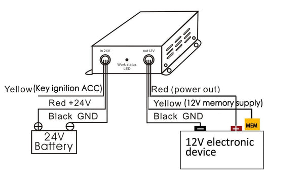 • Yellow Input (Key Ignition ACC), Red Input: (+), Black Input: (-) GND; Yellow Output: Memory, Red Output(+), Black Output(-), if no memory function required, Output Red Wire and Yellow Wire can be connected in parallel to the + Output
